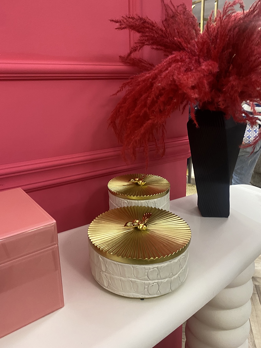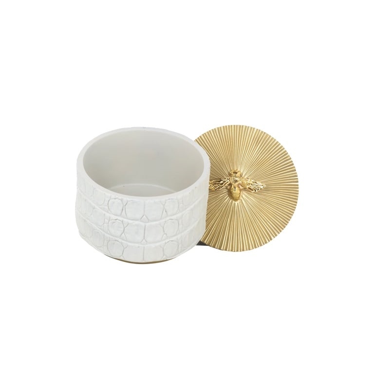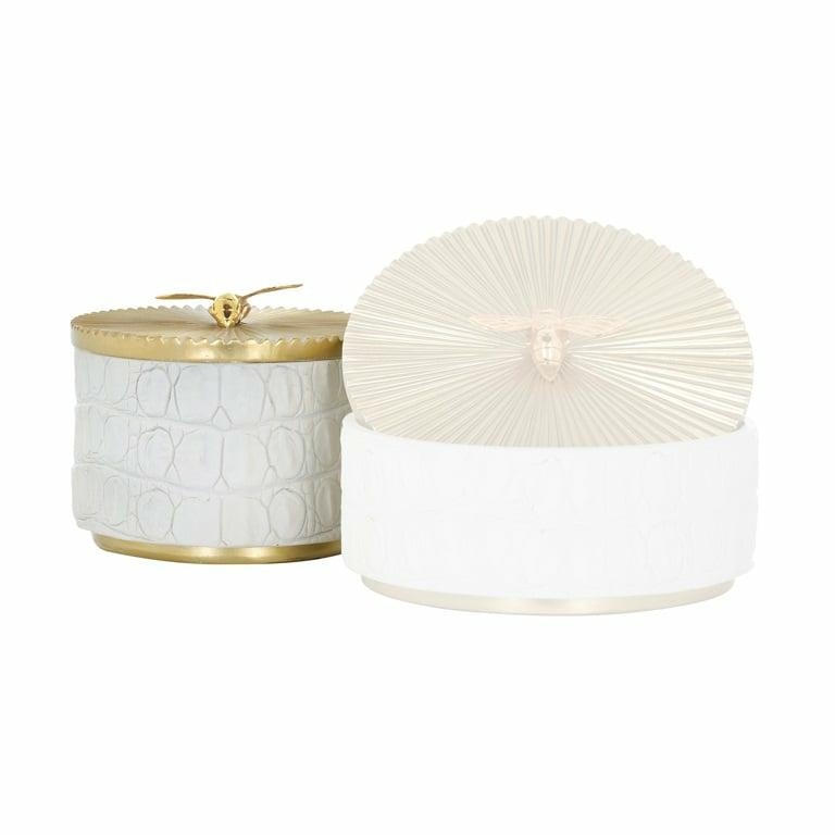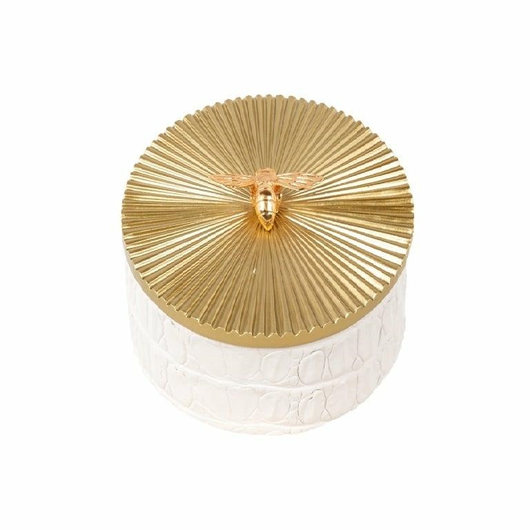 Entdecken Sie die einzigartige Schmuckschatulle Beez S, ein einzigartiges Accessoire, das die Eleganz jeder Inneneinrichtung unterstreicht. Diese elegante, runde Schmuckschatulle aus hochwertigem Harz ist vom Art déco-Stil inspiriert und zieht mit ihrem einzigartigen Design die Blicke auf sich. Die gesamte Dose ist mit einer schönen weißen Textur verziert , die das zarte Aussehen von Krokodilhaut imitiert und ihr einen einzigartigen Charakter und ein exklusives Aussehen verleiht. Der goldene Deckel, der mit einer dezent geschnitzten Biene verziert ist, verleiht ihr einen zusätzlichen Hauch von Glamour. Beez S ist nicht nur ein praktisches Schmuckbehältnis, sondern auch ein einzigartiges Dekorationselement, das einen ungewöhnlichen Charme in Ihr Interieur bringt. Er ermöglicht es Ihnen, Ihre Schmuckstücke auf elegante Weise aufzubewahren und verleiht Ihrer Umgebung gleichzeitig einen Hauch von Luxus und Stil. Dieses faszinierende Produkt wird nicht nur Ihre Schmuckschätze perfekt organisieren, sondern ist auch die perfekte Ergänzung für ein modernes Interieur im Art déco- und Glamour-Stil. Der Beez S Behälter ist auch in einer größeren Version und in Schwarz erhältlich, so dass Sie ihn an Ihre individuellen Vorlieben und Bedürfnisse anpassen können.
