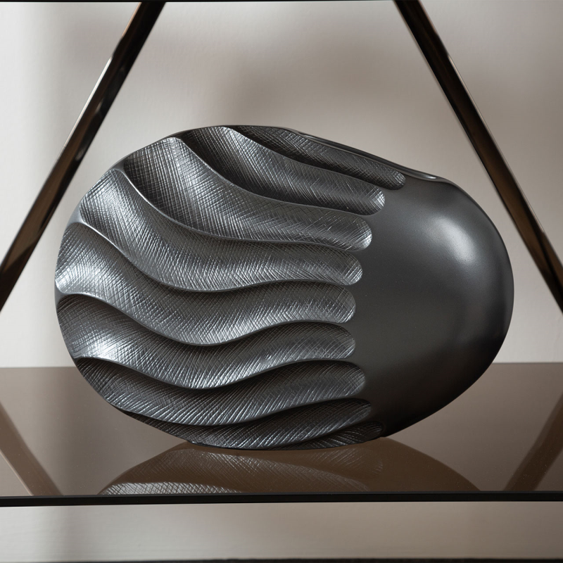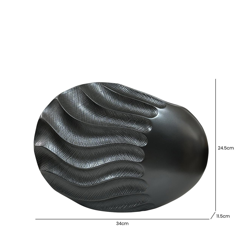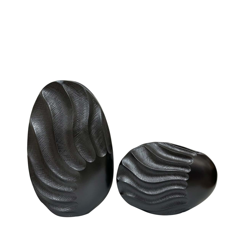 Diese einzigartige dekorative Vase ist ein einzigartiges Accessoire, das Ihren Raum mit Sicherheit beleben wird. Durch die Kombination aus modernem Design und organischen Elementen passt sie perfekt auf einen Couchtisch, eine Kommode oder ein Regal und verleiht jedem Raum einen einzigartigen Charakter und Eleganz. Die Vase aus haltbarem Polymerharz ist mit einem unverwechselbaren Sandwellenmuster verziert, das ihr einen schönen Glanz in einem intensiven, tiefschwarzen Farbton verleiht. Präzise Details und Rillen unterstreichen ihren einzigartigen Charakter und verleihen ihr einen zarten Hauch von Rustikalität. Die fließenden Linien und Wellen strahlen Dynamik und Bewegung aus und verleihen dem Ganzen einen einzigartigen Ausdruck. Die Vase passt perfekt in helle und dunkle Räume, die im Kolonialstil eingerichtet sind. Die Vase zieht mit ihrer originellen Form die Aufmerksamkeit auf sich und verleiht der Einrichtung einen einzigartigen Charakter. Die einfache Reinigung macht die Vase nicht nur zu einem schönen Anblick, sondern auch zu einem praktischen Dekorationselement. Außerdem können Sie die Vase auch in einer größeren Größe kaufen, um eine stimmige dekorative Komposition im Raum zu schaffen.
