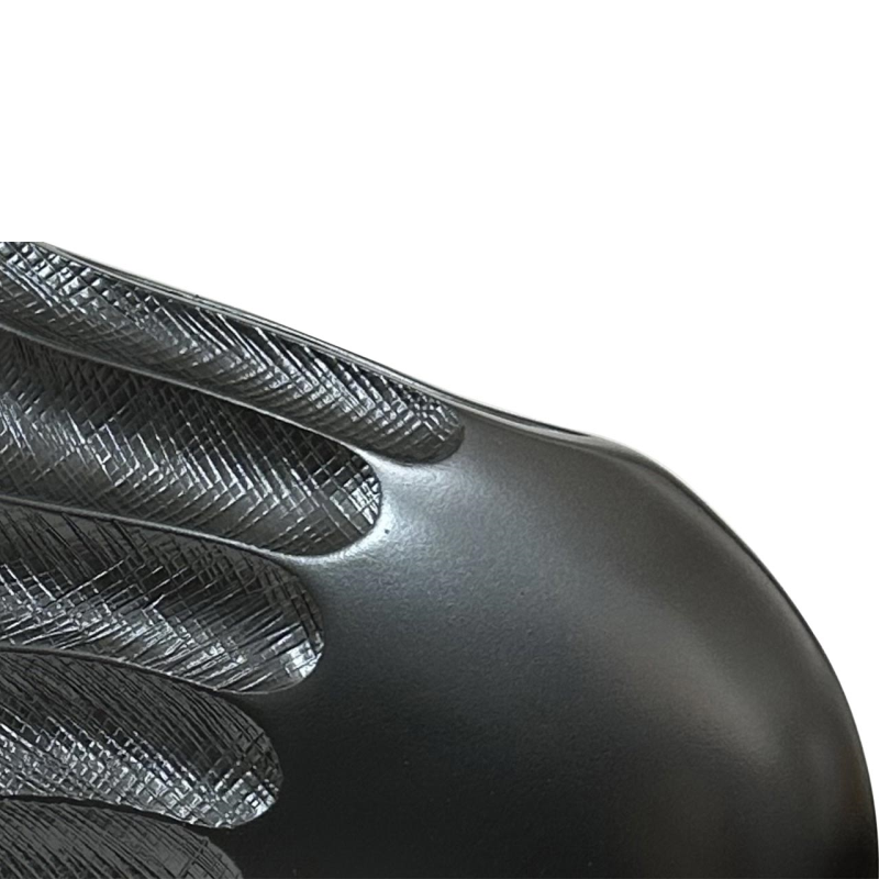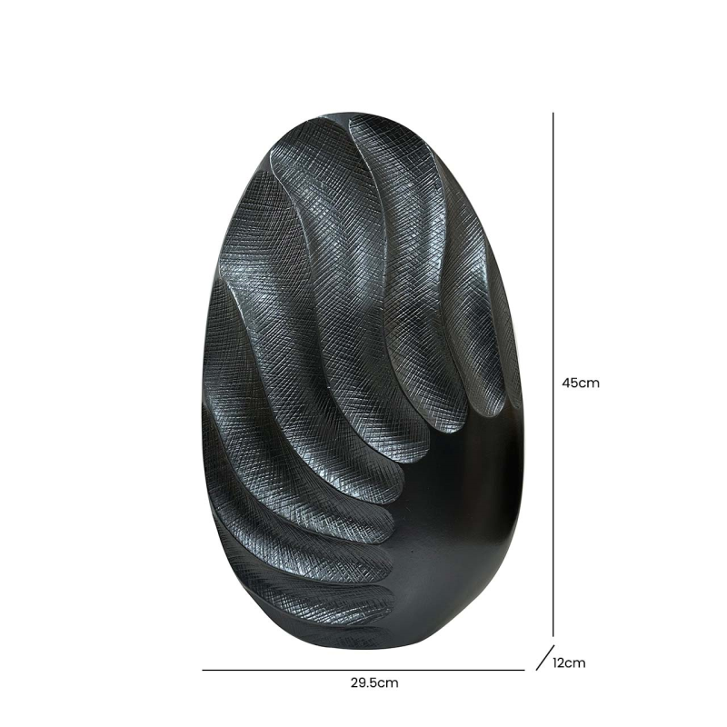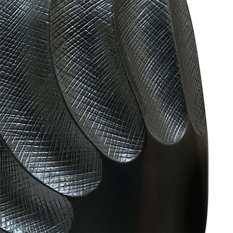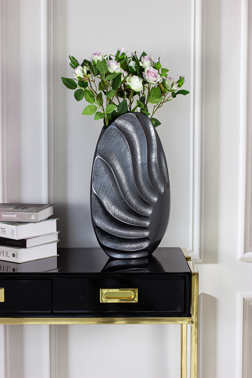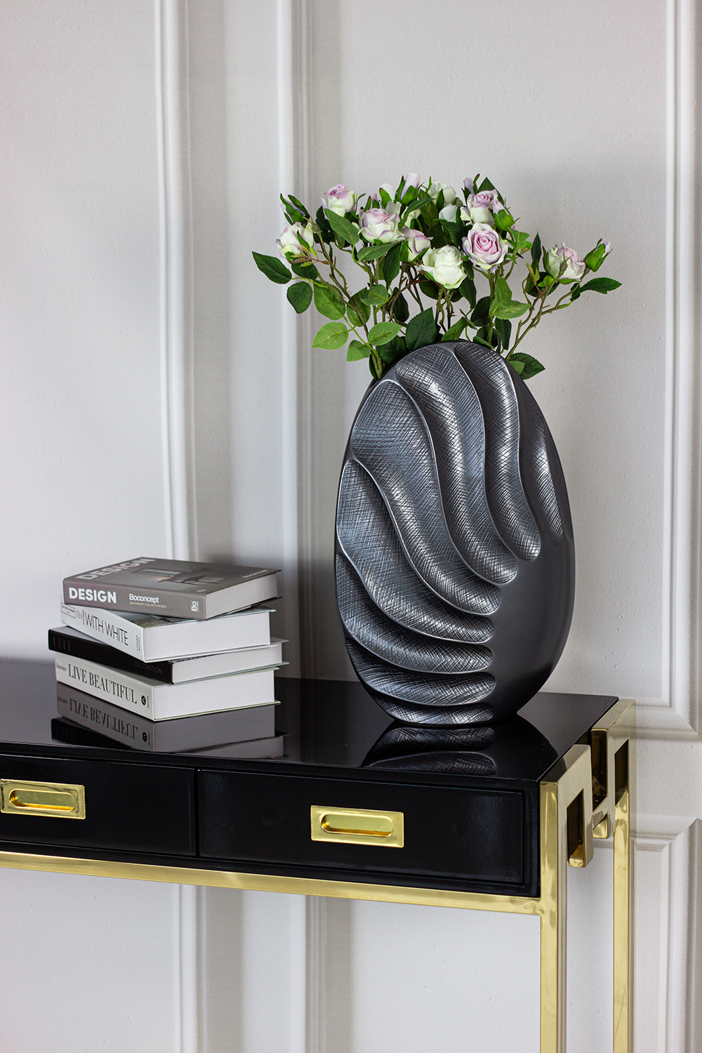 Diese einzigartige dekorative Vase ist ein unvergleichliches Accessoire, das den Charakter Ihres Raumes mit Sicherheit bereichern wird. Sie ist ein harmonisches Nebeneinander von modernem Design und natürlichen Details, das einen Couchtisch, eine Kommode oder ein Regal wunderbar ergänzt und jeder Einrichtung eine ungewöhnliche Atmosphäre und klassische Eleganz verleiht. Die Vase besteht aus langlebigem Polymerharz und ist mit einem unverwechselbaren Muster aus Sandwellen verziert, das ihr einen schönen Glanz in einem intensiven Schwarzton verleiht. Die fein gearbeiteten Muster und Rillen unterstreichen den einzigartigen Charakter dieses Objekts und verleihen ihm einen zarten Hauch von Rustikalität. Mit seinen fließenden Kurven und Wellen strahlt das gesamte Design Dynamik und Bewegung aus. Die Vase passt perfekt in helle, im Kolonialstil eingerichtete Räume, zieht mit ihrer originellen Form die Blicke auf sich und verleiht der Einrichtung einen einzigartigen Charakter. Die leicht zu reinigende Oberfläche der Vase macht sie nicht nur schön, sondern auch zu einem praktischen Dekorationselement. Da sie auch in einer kleineren Größe erhältlich ist, können Sie eine stimmige dekorative Komposition in Ihrem Raum schaffen.