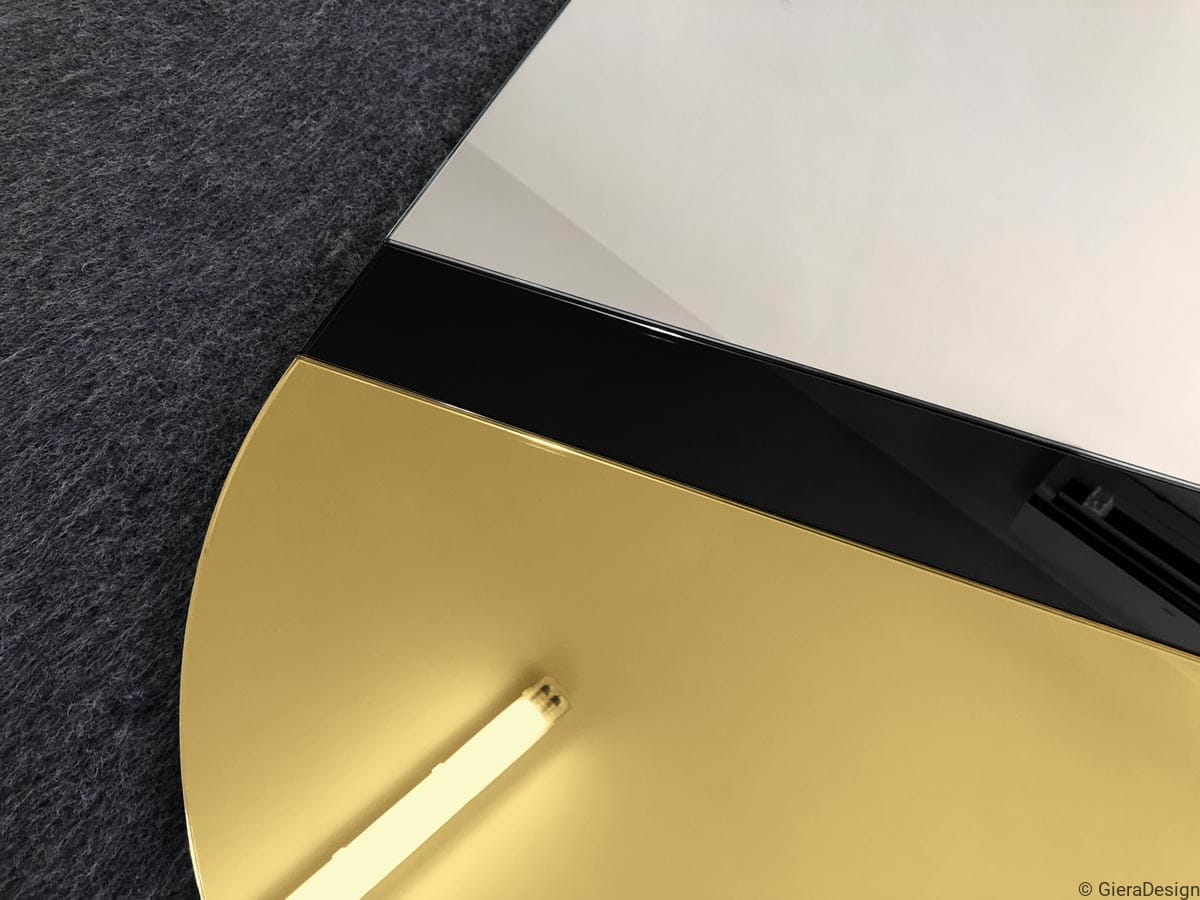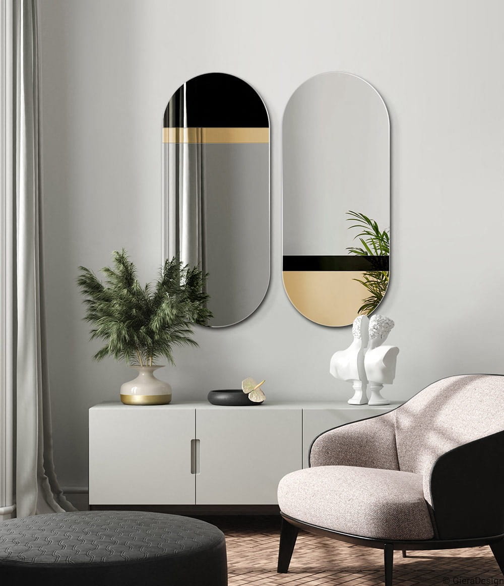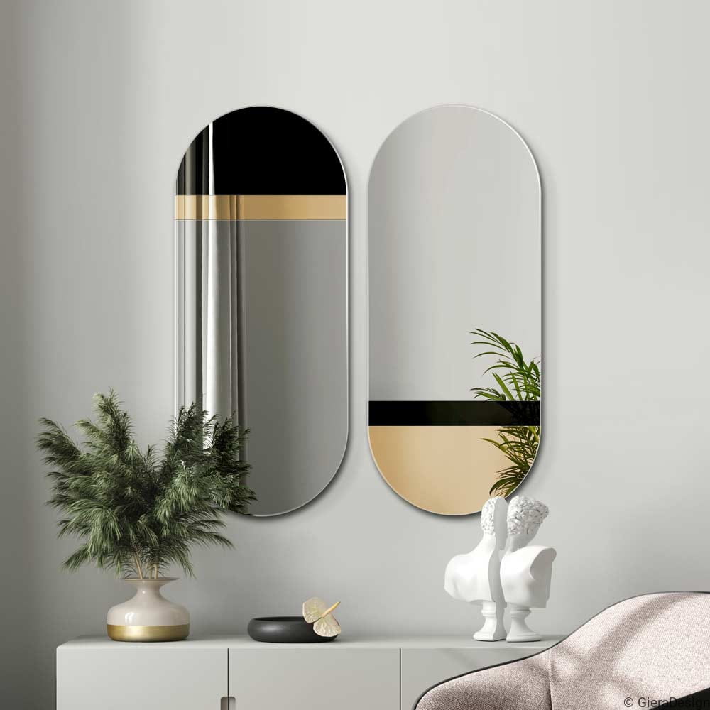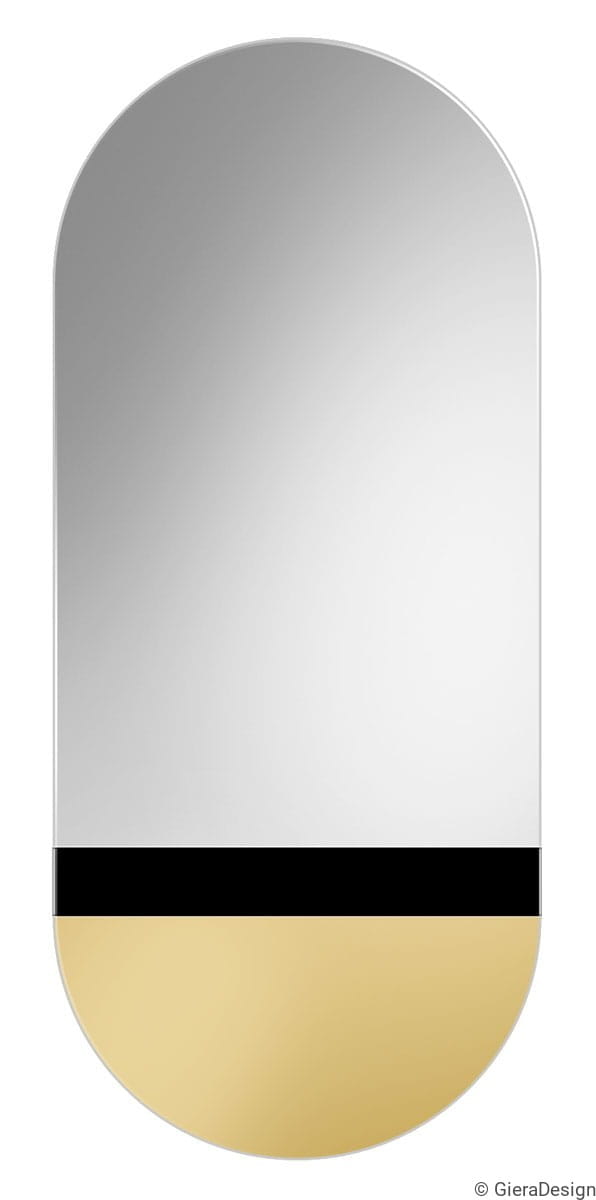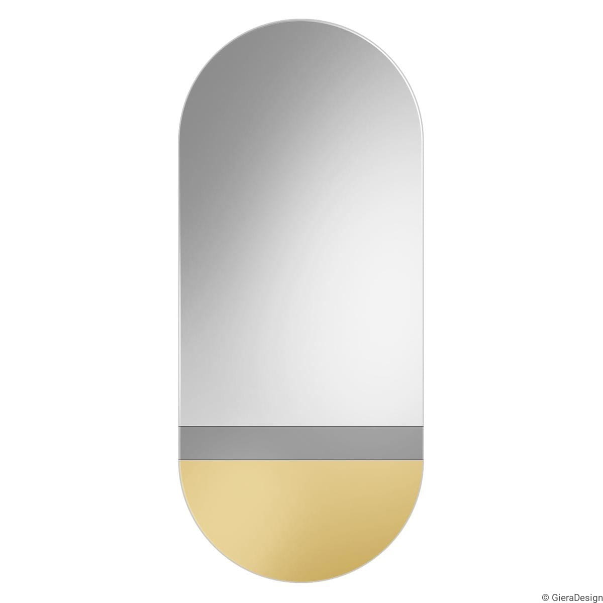 Eine Kombination aus verschiedenen Farben, Texturen und Formen. Dieser einzigartige Fusion Spiegel im modernistischen Stil, der von der Grafik der 1960er Jahre inspiriert ist, wird eine einzigartige Dekoration für ein modernes Wohnzimmer, ein Schlafzimmer oder einen Flur sein. Der ovale Spiegel mit einem subtilen Goldakzent passt perfekt zu den Trends eklektischer Arrangements. Die Konstruktion des Fusion Spiegels basiert auf drei Elementen, die miteinander verklebt wurden. Der Hauptteil ist ein traditioneller silberner Spiegel, der durch einen Streifen in der Farbe Ihrer Wahl und einen Halbkreis aus Spiegeln in einem Goldton ergänzt wird. Die große Auswahl an Varianten ermöglicht es Ihnen, Ihre ganz persönliche Komposition zu schaffen, die perfekt zum Charakter des Raumes passt.