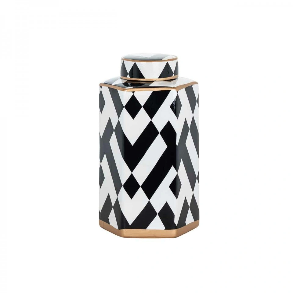 Der Keramikbehälter/die Keramikvase ist nicht nur ein praktisches Stück, sondern auch eine stilvolle Ergänzung für jede Einrichtung. Sein geometrisches schwarz-weißes Design verleiht ihm einen modernen Charakter, der sich perfekt in eine Vielzahl von Umgebungen einfügt. Die kupferfarbenen Details tragen zu seiner Eleganz und seinem einzigartigen Charme bei und unterstreichen die hohe Qualität der Verarbeitung. Dieser Behälter/Vase kann sowohl eine dekorative als auch eine praktische Funktion erfüllen. Er ist der perfekte Ort, um Schmuckstücke aufzubewahren oder frische Blumen zu präsentieren. Mit ihrem einzigartigen Design und ihrer vielseitigen Verwendbarkeit wird sie zu einem festen Bestandteil der Einrichtung Ihres Hauses.