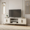 - Luxuriöse Materialien – Das goldene Finish von Mangoholz und MDF sorgt für Haltbarkeit und Eleganz.
