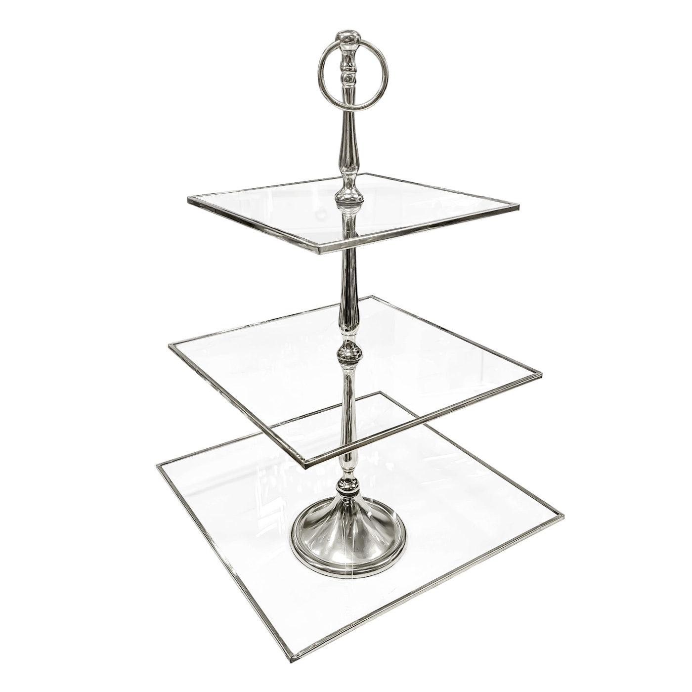 Höhe: 50 cm Abmessungen des großen Tellers (L x B): 30,6×30,6 cm Maße des mittleren Tellers (L x B): 25,5×25,5 cm Maße des kleinen Tellers (L x B): 20,6×20,6 cm Material: Glas, rostfreier Stahl