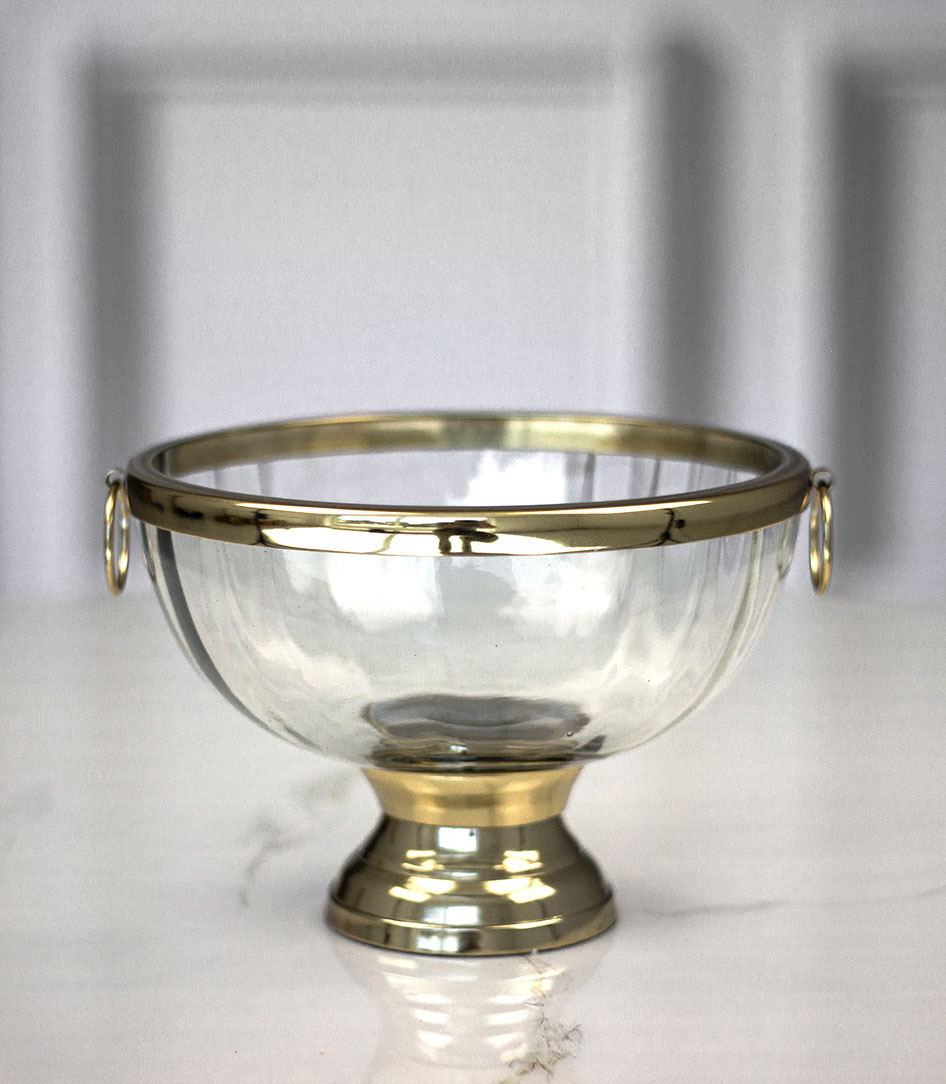 Wir stellen Ihnen unsere einzigartige Platte auf einem eleganten goldenen Fuß vor, die einzigartigen Glamour und klassischen Stil in Ihr Interieur bringt. Das halbrunde Glasdesign besticht durch seine Transparenz, während das goldene Bein diesem einzigartigen Teller Charakter verleiht. Sie ist nicht nur eine praktische Platte zum Servieren von Snacks oder Desserts, sondern auch ein schönes Dekorationselement. Das filigrane Design der Platte fügt sich perfekt in eine Vielzahl von Einrichtungen ein und schafft eine einzigartige Atmosphäre bei eleganten Tischrunden. Die Glasoberfläche mit ihren schönen Verzierungen bildet den perfekten Hintergrund für die servierten Speisen und unterstreicht deren Geschmack und ästhetische Präsentation. Die goldenen Details harmonieren mit dem klaren Glas und bilden einen auffälligen Kontrast, der den traditionellen Stil unterstreicht und jedem Raum Glanz verleiht. Die Platte ist mit dekorativen Griffen versehen, die nicht nur den Charme der Platte unterstreichen, sondern ihr auch einen traditionellen Touch verleihen. Das goldene Metallbein sorgt nicht nur für Stabilität, sondern auch für einen Hauch von Luxus und harmoniert perfekt mit der Ästhetik traditioneller Innenräume. Es ist eine ungewöhnliche Kombination aus Funktionalität und Eleganz, die das Prestige jedes servierten Gerichts unterstreicht und gleichzeitig eine raffinierte dekorative Note auf jeden Tisch bringt. Lassen Sie unsere Platte auf einem goldenen Bein Ihrem Interieur einen einzigartigen Charme und Eleganz verleihen.