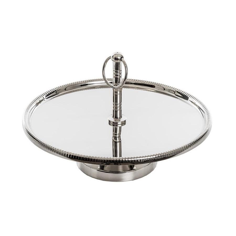 Die klassische silberfarbene Edelstahlplatte ist das perfekte Accessoire zum Servieren von Kuchen, Obst oder Snacks. Die runde Platte ist eine perfekte Dekoration für den Esszimmertisch oder das Sideboard im Wohnzimmer. Sie sieht in vielen Einrichtungsstilen großartig aus. Sie passt sowohl zu modernen und klassischen Räumen als auch zu Räumen im Industrie- oder Glamour-Stil. Der Hochglanz des Metalls reflektiert wunderschön das Licht und ist eine einzigartige Dekoration für den Tisch. Die breite und glatte Oberfläche und die runde Form der Platte bieten eine ideale Unterlage für Snacks, Obst oder Dekorationsgegenstände. Das universelle Design der Platte ermöglicht es auch, Schmuck oder kleine Accessoires im Schlafzimmer darauf abzulegen. Die Platte ist mit einem praktischen Griff ausgestattet, mit dem Sie sie leicht von einem Ort zum anderen bewegen können.