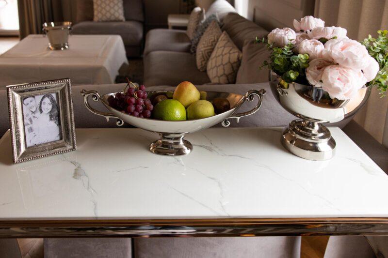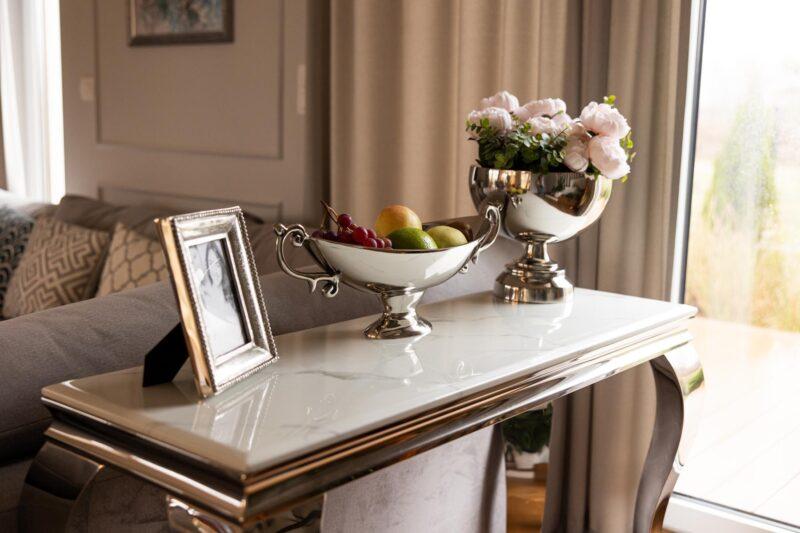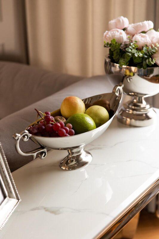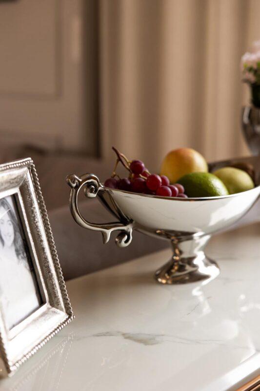 Der elegante, länglich geformte Metallteller ist die ideale Lösung zum Servieren von Obst oder Snacks und eignet sich auch perfekt als stilvolle Dekoration für eine Kommode oder ein Sideboard. Dieser schöne Teller steht auf einem stabilen, glänzenden Fuß und zeichnet sich durch seine charmanten, dekorativen Griffe aus. Die glänzende Oberfläche des Tellers glänzt wie Silber und reflektiert das Licht wunderschön. Dieses klassische und zeitlose Einrichtungsstück ist die ideale Wahl für Liebhaber von Objekten mit Geschichte und gutem Stil. Der Silberteller ist aus hochwertigem Nickel gefertigt, was ihn nicht nur zu einem ästhetisch ansprechenden Accessoire macht, sondern auch zu einem praktischen Gefäß für die Aufbewahrung verschiedener Früchte auf dem Esstisch oder auf der Küchentheke. Die reiche Verzierung der Platte wird klassische Interieurs mit einem Hauch von Glamour perfekt akzentuieren.