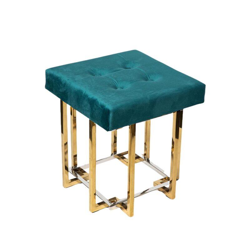 Der gepolsterte Hocker mit einzigartigem Design wird Ihrer Einrichtung einen besonderen Stil verleihen. Der quadratische Hocker ist die perfekte Ergänzung für eine elegante, moderne Einrichtung im Glamour-Stil. Er macht sich gut im Wohnzimmer als zusätzliche Sitzgelegenheit, aber auch als Schminktisch im Schlafzimmer. Die Kombination aus silbernem und goldenem Metall und hochwertigem Velours verleiht jeder Einrichtung zweifellos Eleganz und Stil. Das Gestell des Hockers ist aus rostfreiem Stahl in einem goldenen Farbton gefertigt. Die hochglänzende Oberfläche des Metalls verleiht der gesamten Struktur ein äußerst luxuriöses Aussehen. Die Beine sind mit einem glänzenden silbernen Rahmen versehen, der ihnen einen modernen Charakter und ein einzigartiges Design verleiht. Die goldenen Profile mit dem silbernen Rahmen sehen phänomenal aus und machen die gesamte Struktur solide und langlebig. Ein idealer Vorschlag für alle, die unkonventionelle Designlösungen und starke Akzente im Interieur mögen. Das Polstermaterial ist ein hochwertiger, modischer Velours. Sein schöner grüner Farbton sorgt für einen einzigartigen visuellen Effekt, und die dekorative Steppung verleiht dem Möbel einen glamourösen Stil. Der weiche, angenehm zu berührende Stoff macht den Hocker nicht nur sehr bequem, sondern auch langlebig und pflegeleicht.