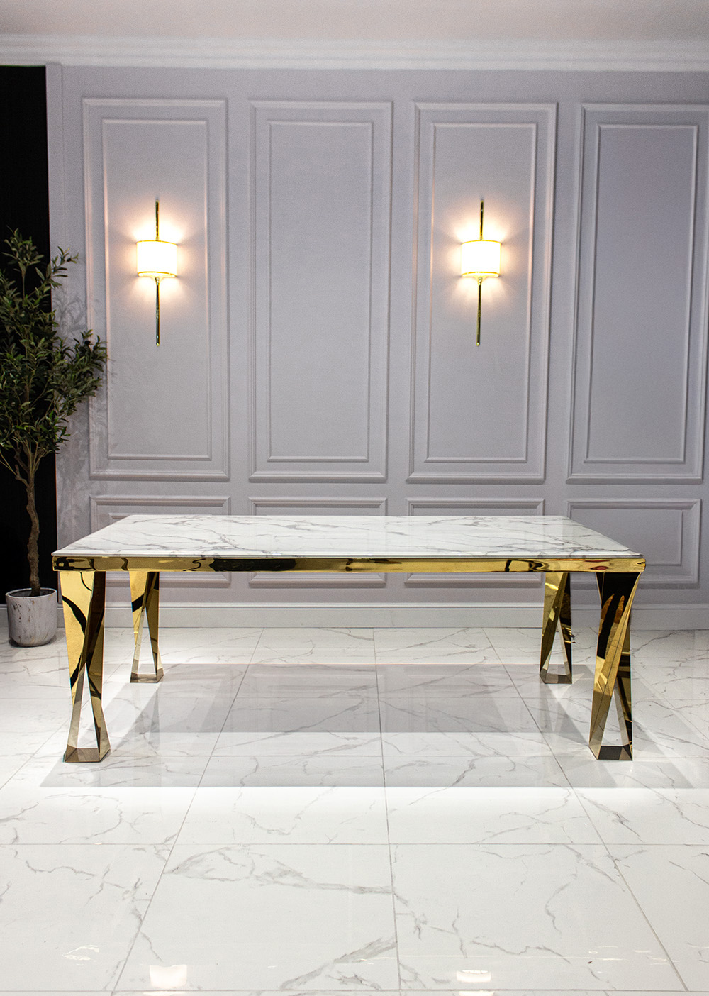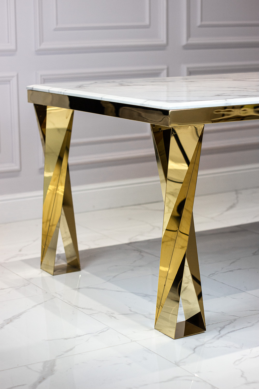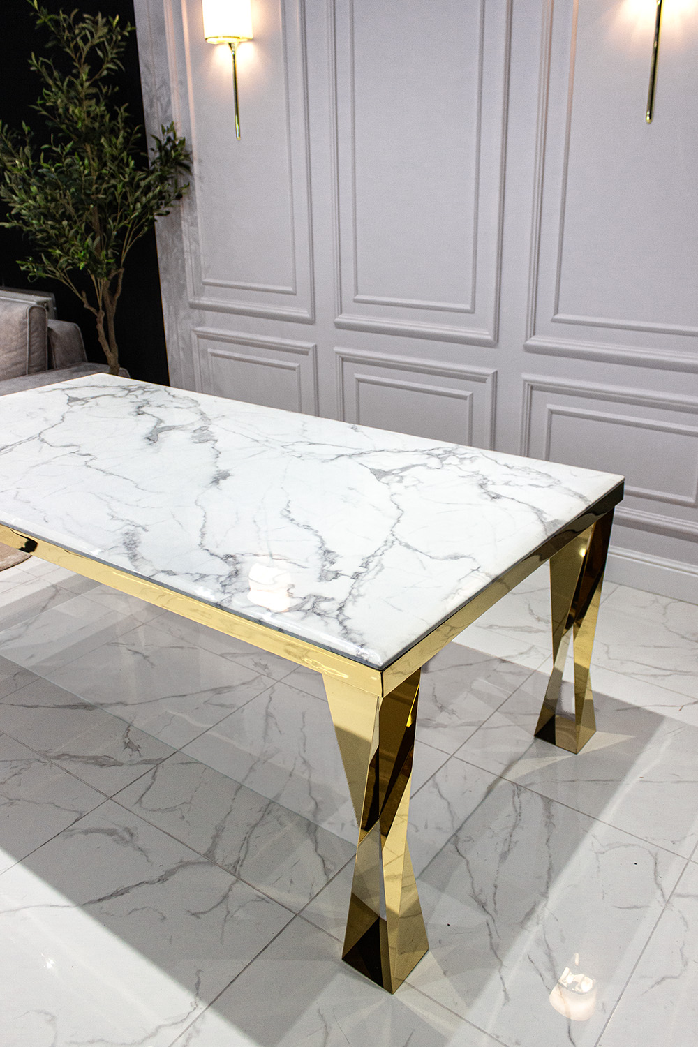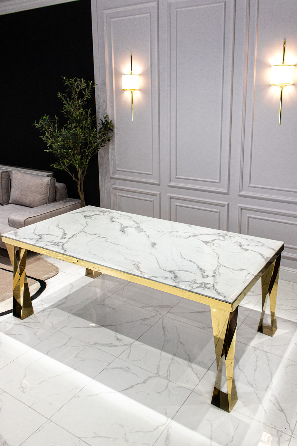 Wir laden Sie ein, einen raffinierten rechteckigen Esstisch zu entdecken, der die Essenz von Eleganz und Luxus verkörpert. Seine Platte aus weißem Marmorkonglomerat strahlt einen raffinierten Charme aus und verleiht Ihrem Ess- oder Wohnzimmer eine einzigartige Note. Die goldenen Beine des Tisches aus hochwertigem Edelstahl beeindrucken mit ihrer spiralförmigen Kurve und verleihen ihm die für den Glamour-Stil charakteristische Feinheit und Raffinesse. Der Esstisch beeindruckt nicht nur durch sein Aussehen, sondern bietet auch einen komfortablen Platz für Familienessen oder Partys. Seine solide Konstruktion garantiert Stabilität und Langlebigkeit, so dass er viele Jahre lang halten wird. Der weiße Marmor, kombiniert mit goldenen Akzenten, verleiht dem Tisch einen einzigartigen Glanz und eine Eleganz, die sich perfekt in eine Vielzahl von Einrichtungen einfügt. Dieses einzigartige Möbelstück wird nicht nur zu einem praktischen Element des Esszimmers, sondern auch zu einem Kunstwerk, das den raffinierten Geschmack und Stil des Besitzers unterstreicht. Entdecken Sie eine neue Dimension von Luxus und Komfort in Ihrem Zuhause mit diesem einzigartigen Esstisch.