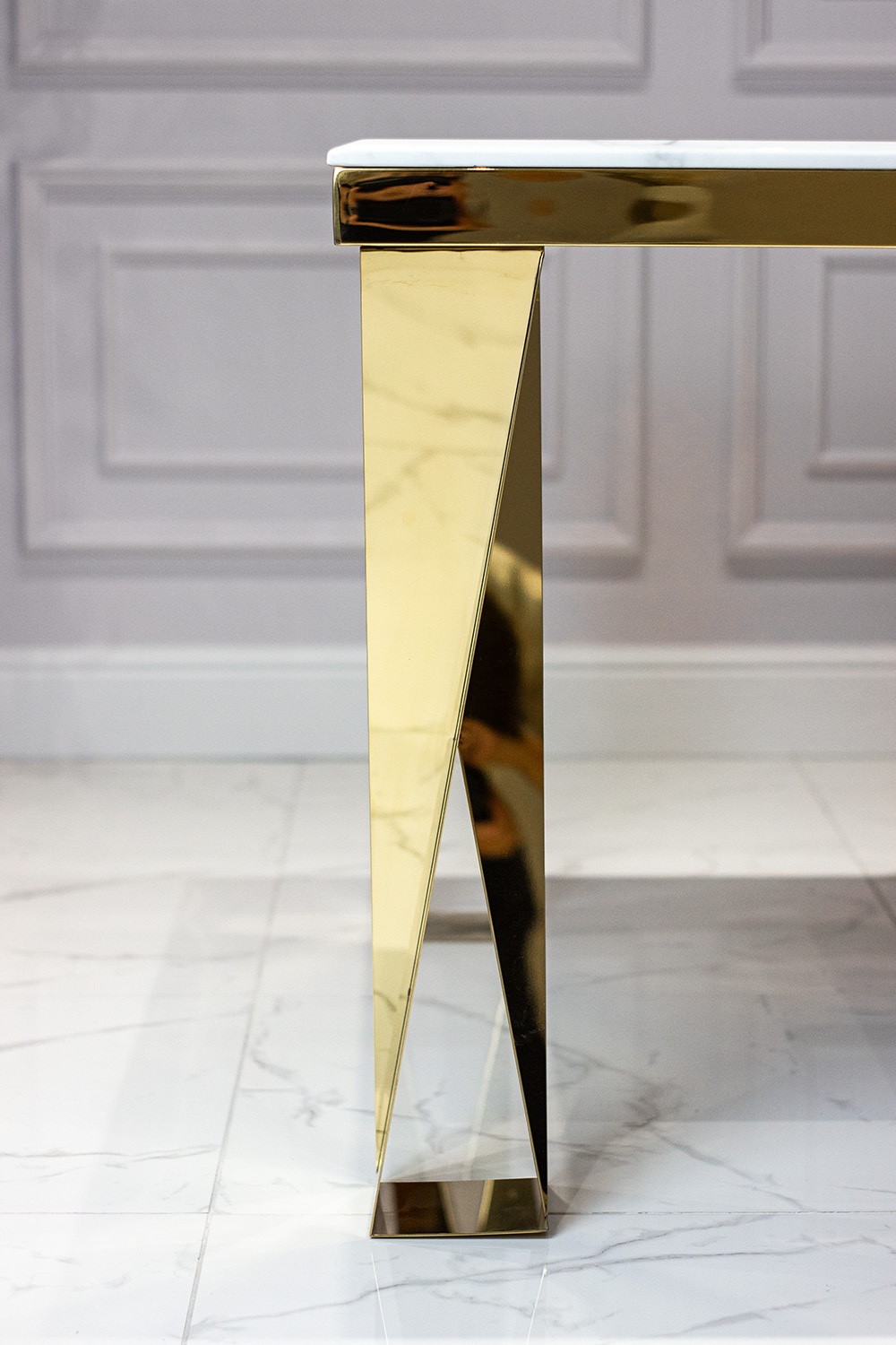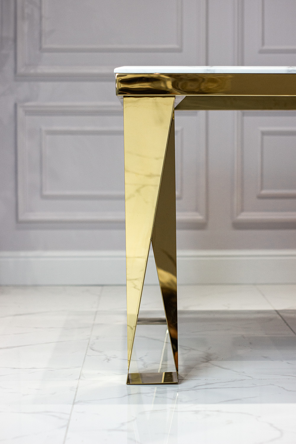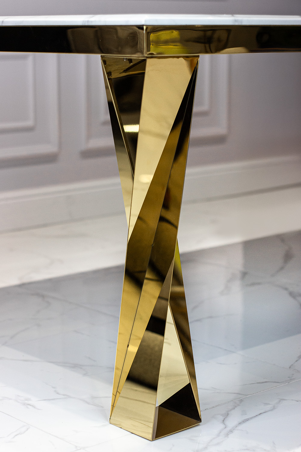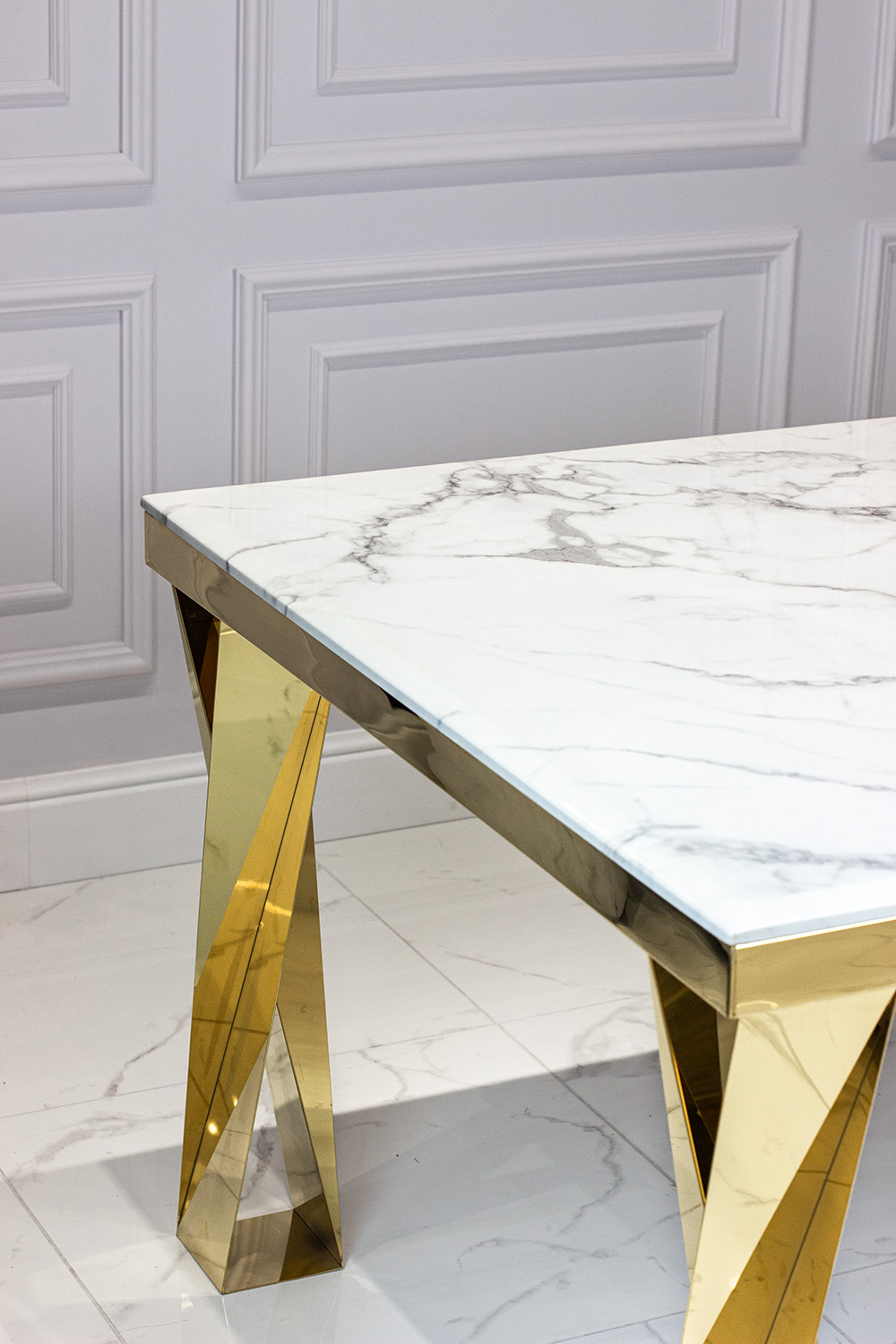 Wir laden Sie ein, einen raffinierten rechteckigen Esstisch zu entdecken, der die Essenz von Eleganz und Luxus verkörpert. Seine Platte aus weißem Marmorkonglomerat strahlt einen raffinierten Charme aus und verleiht Ihrem Ess- oder Wohnzimmer eine einzigartige Note. Die goldenen Beine des Tisches aus hochwertigem Edelstahl beeindrucken mit ihrer spiralförmigen Kurve und verleihen ihm die für den Glamour-Stil charakteristische Feinheit und Raffinesse. Der Esstisch beeindruckt nicht nur durch sein Aussehen, sondern bietet auch einen komfortablen Platz für Familienessen oder Partys. Seine solide Konstruktion garantiert Stabilität und Langlebigkeit, so dass er viele Jahre lang halten wird. Der weiße Marmor, kombiniert mit goldenen Akzenten, verleiht dem Tisch einen einzigartigen Glanz und eine Eleganz, die sich perfekt in eine Vielzahl von Einrichtungen einfügt. Dieses einzigartige Möbelstück wird nicht nur zu einem praktischen Element des Esszimmers, sondern auch zu einem Kunstwerk, das den raffinierten Geschmack und Stil des Besitzers unterstreicht. Entdecken Sie eine neue Dimension von Luxus und Komfort in Ihrem Zuhause mit diesem einzigartigen Esstisch.