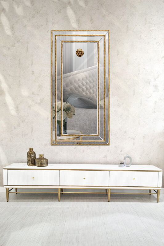 200 x 40 x 44 cm RTV-Schrank Farbe: Weiß, Gold Material: MDF, Edelstahl, Steinsinter