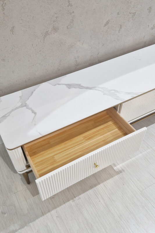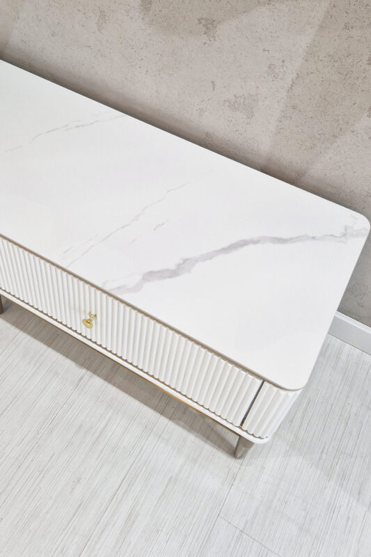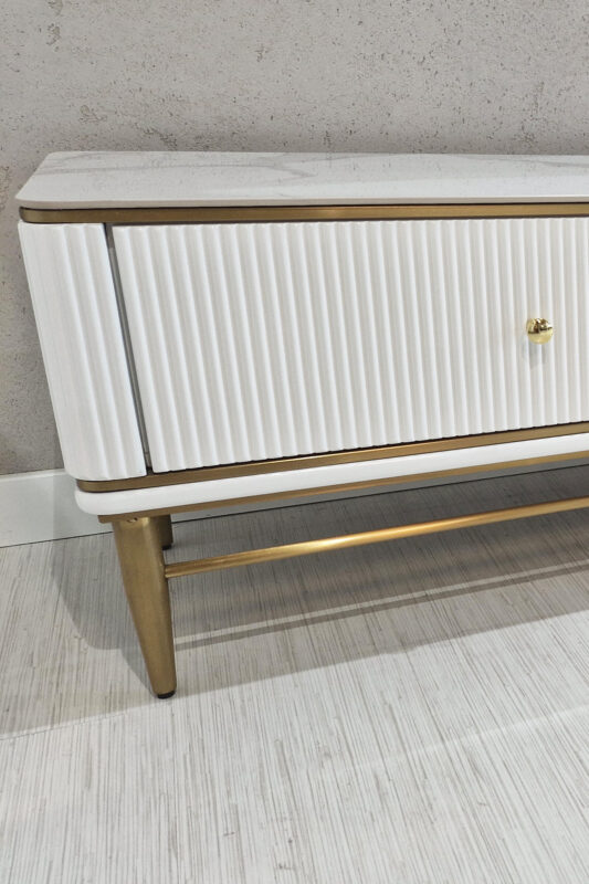 Der weiße RTV-Schrank mit geriffeltem Korpus und goldenen Metallakzenten ist die ideale Wahl für alle, die Eleganz und außergewöhnliches Design bei Möbeln von höchster Qualität schätzen. Die aus weißem Stein gesinterte Platte in Kombination mit goldfarbenen Edelstahlelementen erzeugt einen einzigartigen Effekt und verleiht dem Interieur einen luxuriösen Look. Die seidenmatte Oberfläche und sorgfältig gestaltete Details, wie die goldenen Griffe und die Umrandungen der Schubladen, verleihen dem Schrank einen raffinierten Stil, der ins Auge fällt. Der RTV-Schrank steht auf vier goldenen Beinen mit einer leichten Schräge und einer eleganten Rundung, die ihn perfekt für elegante Wohn- oder Schlafzimmereinrichtungen machen. Seine niedrige, schlanke Form hellt den Raum optisch auf und bildet den perfekten Hintergrund für andere dekorative Elemente. In Kombination mit anderen Möbeln aus der gleichen Kollektion, wie dem Nachttisch und der Kommode, bildet er ein stimmiges Set, das der Einrichtung einen repräsentativen Charakter verleiht.