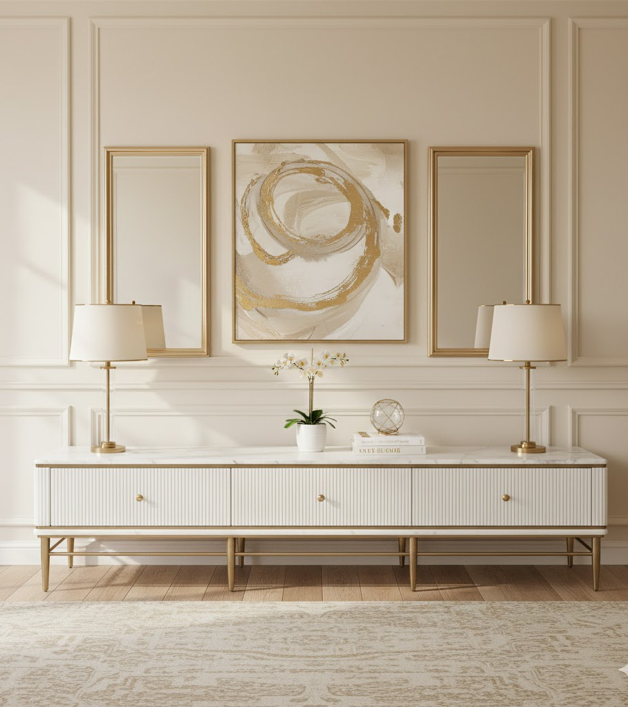 - Luxuriöses Design – Die Kombination von weißem Sinterstein mit goldenen Akzenten verleiht der Einrichtung einen exklusiven Touch.