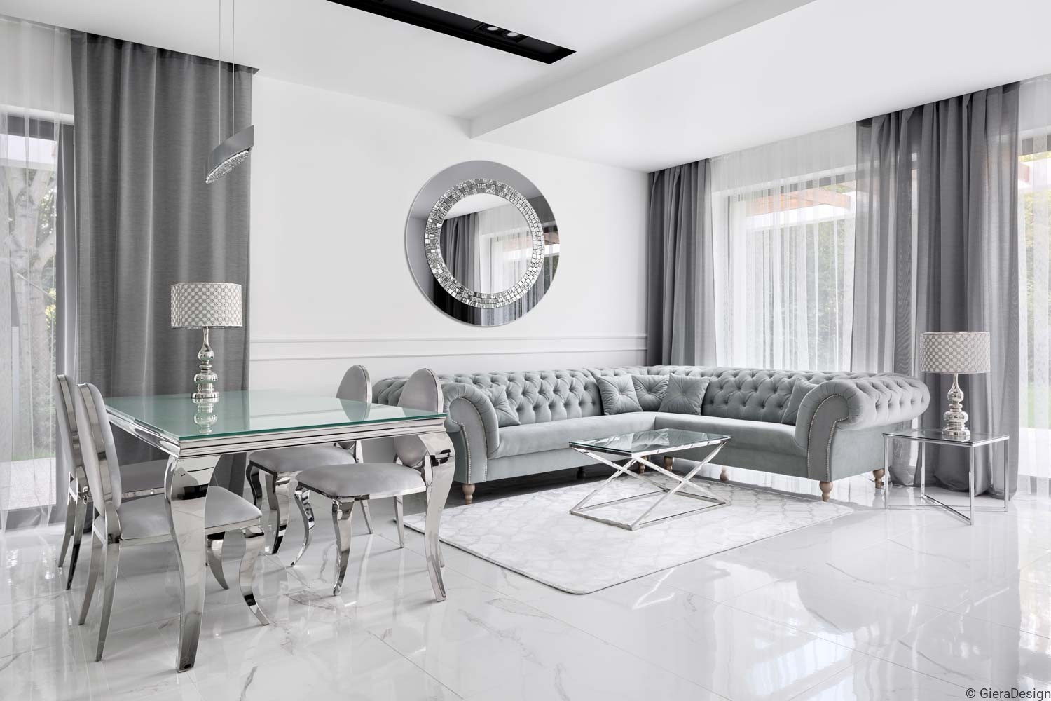 Der dekorative Wandspiegel im Glamour-Stil ist ein einzigartiges Element, das die Blicke auf sich zieht und dem Interieur außergewöhnliche Eleganz verleiht. Das moderne Design des Spiegels wird durch seinen Rahmen aus Glasmosaik präsentiert, der Luxus und stilvolle Finesse ausstrahlt. Der runde Spiegel ist ganz aus Glas gefertigt. Er hat einen Mosaikrahmen, wobei jedes der Mosaikelemente in Textur und Farbton variiert und dem Raum einen einzigartigen Glanz und Charakter verleiht. Die verspiegelte Oberfläche des Rahmens in einem Graphit-Ton strahlt einen luxuriösen Look und modernen Charakter aus. Dieser dekorative Spiegel erfüllt nicht nur praktische Funktionen, sondern ist auch ein unverwechselbares dekoratives Element, das dem Raum einen einzigartigen Charakter verleiht. Er harmoniert perfekt mit einer Vielzahl von Einrichtungsstilen und bereichert sowohl das Wohnzimmer, das Schlafzimmer, das Esszimmer als auch den Flur mit seiner Schönheit und seinem einzigartigen Stil.