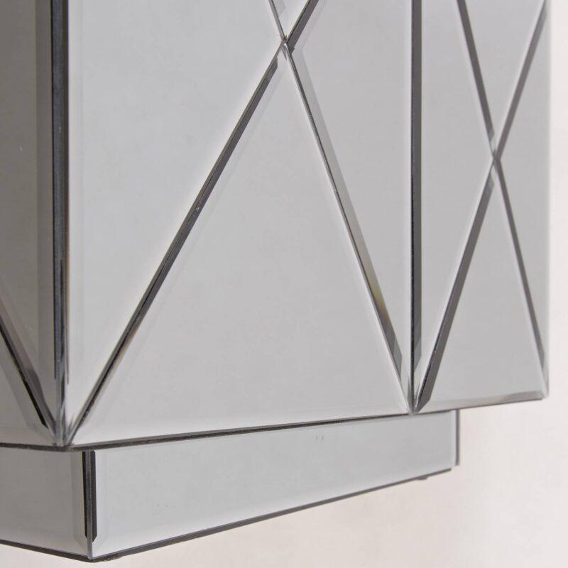Der Beistelltisch Soho wurde aus kleinen Spiegeln gefertigt, die in einem geometrischen Muster angeordnet sind. Darüber hinaus lassen die abgeschrägten Kanten das gesamte Möbelstück außergewöhnlich elegant aussehen. Der Soho Tisch passt ideal zu jeder modernen Inneneinrichtung, in der gedeckte Farben und Spiegeldetails dominieren. Er verleiht jedem Interieur Eleganz, ob im heimischen Schlafzimmer als Nachttisch oder in einer Hotellobby oder einem Büro als Tisch für kleine Gegenstände. Die Soho-Serie umfasst auch einen Couchtisch. Der Soho Beistelltisch wurde aus rauchfarbenen Graphitspiegeln gefertigt. Der Beistelltisch Soho ist ideal für Innenräume, die in einem modernen Stil mit einem Hauch von Glamour eingerichtet sind.
