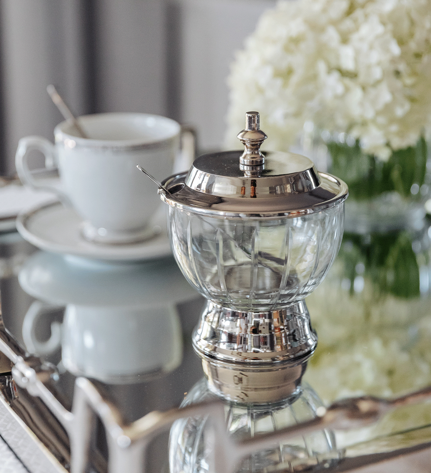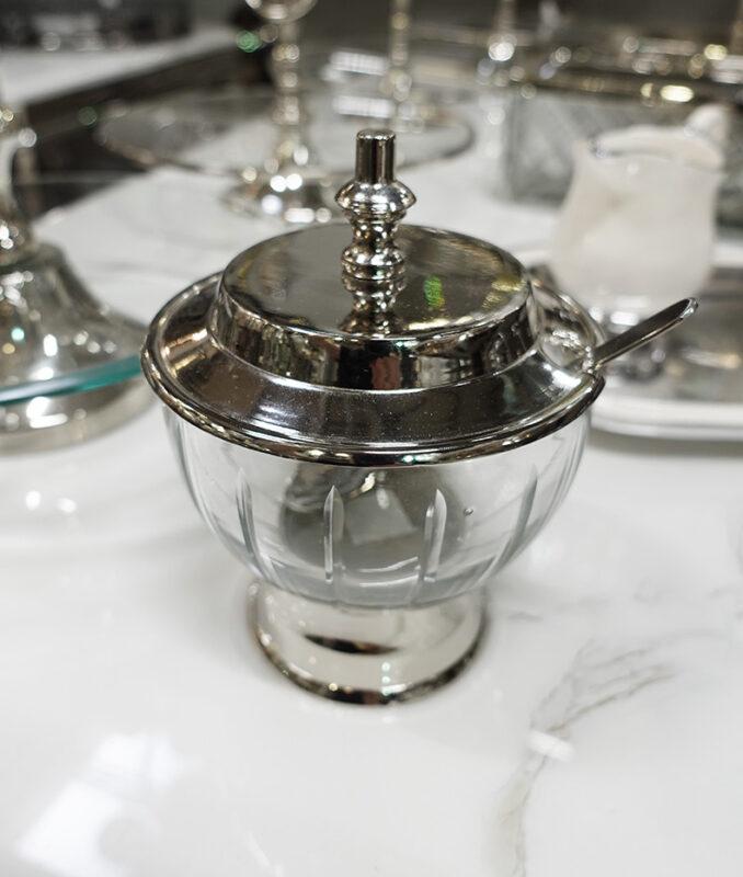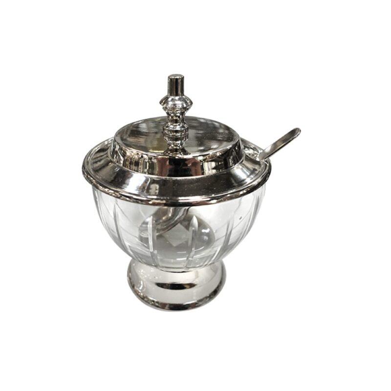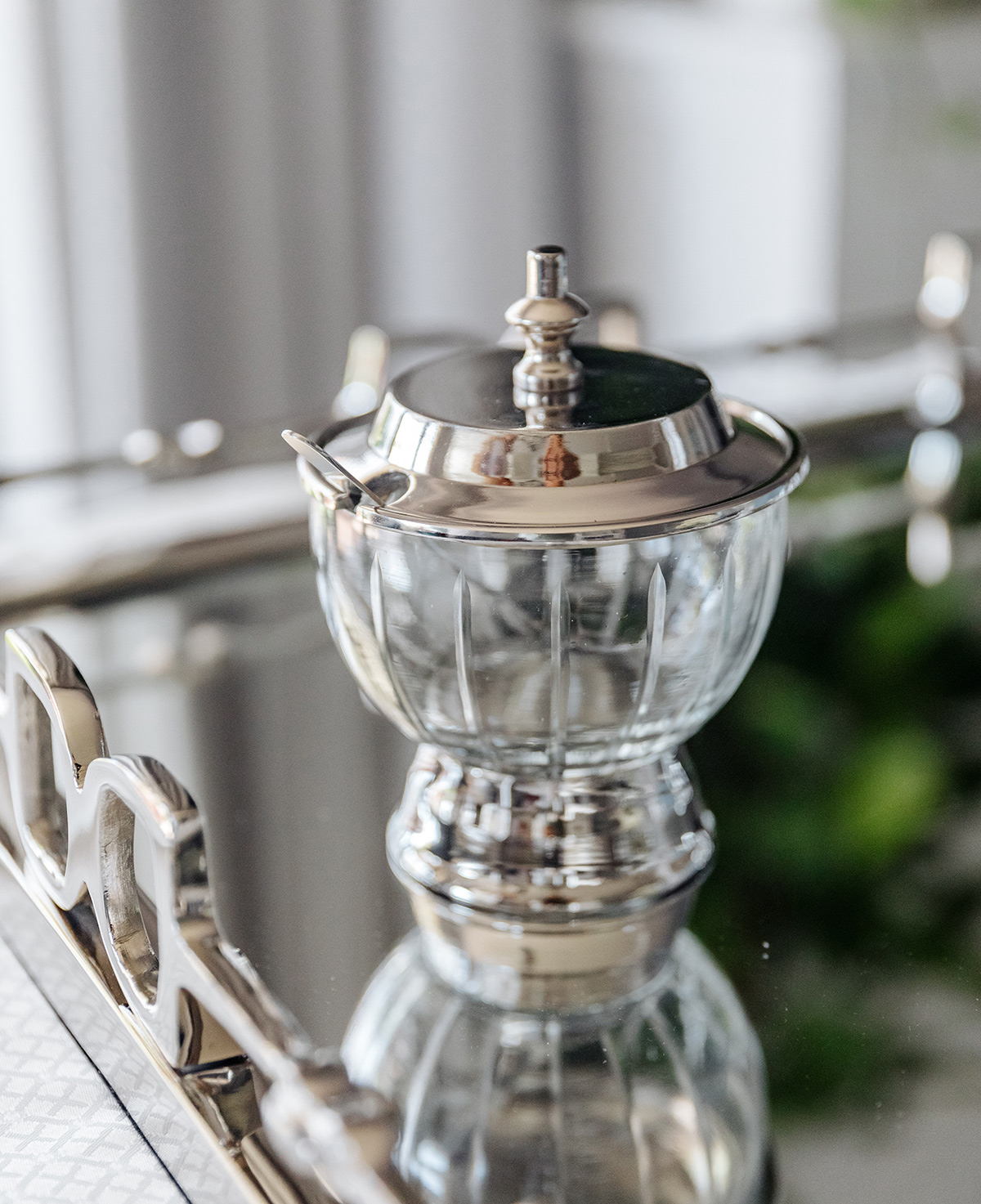 Die elegante Zuckerdose mit Löffel wird jede klassische Tafel mit glamourösen Stilelementen bereichern. Die aus Glas und Edelstahl gefertigte Zuckerdose ist nicht nur ein praktischer Gegenstand, sondern auch ein einzigartiges Accessoire, das jede elegante Tafel bereichern wird. Die Zuckerdose wurde fein aus silberfarbenem Edelstahl gefertigt, während der Metalllöffel, der ein fester Bestandteil des Sets ist, für ein klassisches Finish sorgt. Der silberne Deckel und der Boden der Zuckerdose sind aus hochglanzpoliertem Metall gefertigt. Die silbernen Elemente bilden einen harmonischen Kontrast zu der transparenten Glasoberfläche der Zuckerdose. Diese Zuckerdose zieht als festliches Geschirr sicher die Blicke auf sich und wird zu einem unverzichtbaren Begleiter für entspannte Momente mit aromatischem Kaffee oder Tee.