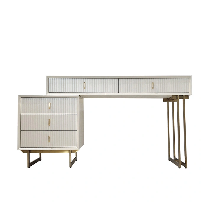 Der Cashmere Frisiertisch mit mobilem Schrank ist ein stilvolles und modernes Möbelstück, das nicht nur den Look Ihres Schlafzimmers bereichert, sondern auch den Komfort Ihrer täglichen Schönheitsroutine erhöht. Seine Funktionalität ergibt sich aus der Kombination von zwei Elementen: einem schlanken Schminktisch mit zwei Schubladen und einem mobilen Schrank mit drei Schubladen, der frei bewegt werden kann. Goldfarbene Metalldetails und dezente Riffelungen verleihen dem Möbel einen luxuriösen und eleganten Look, während der Kaschmir-Ton sich perfekt in eine Vielzahl von Inneneinrichtungen einfügt. Das Design des Schminktisches basiert auf einem leichten, aber robusten Gestell aus goldfarbenem Edelstahl, das Langlebigkeit und Stabilität gewährleistet. Die geriffelten Schubladenfronten sorgen für eine elegante Textur und ziehen die Blicke auf sich, während die geräumigen Schubladen reichlich Platz für Kosmetika und Accessoires bieten. Die Toilette mit mobilem Schrank ist nicht nur praktisch, sondern auch eine dekorative Ergänzung für ein Schlafzimmer im Glamour-, New Yorker oder minimalistischen Stil.