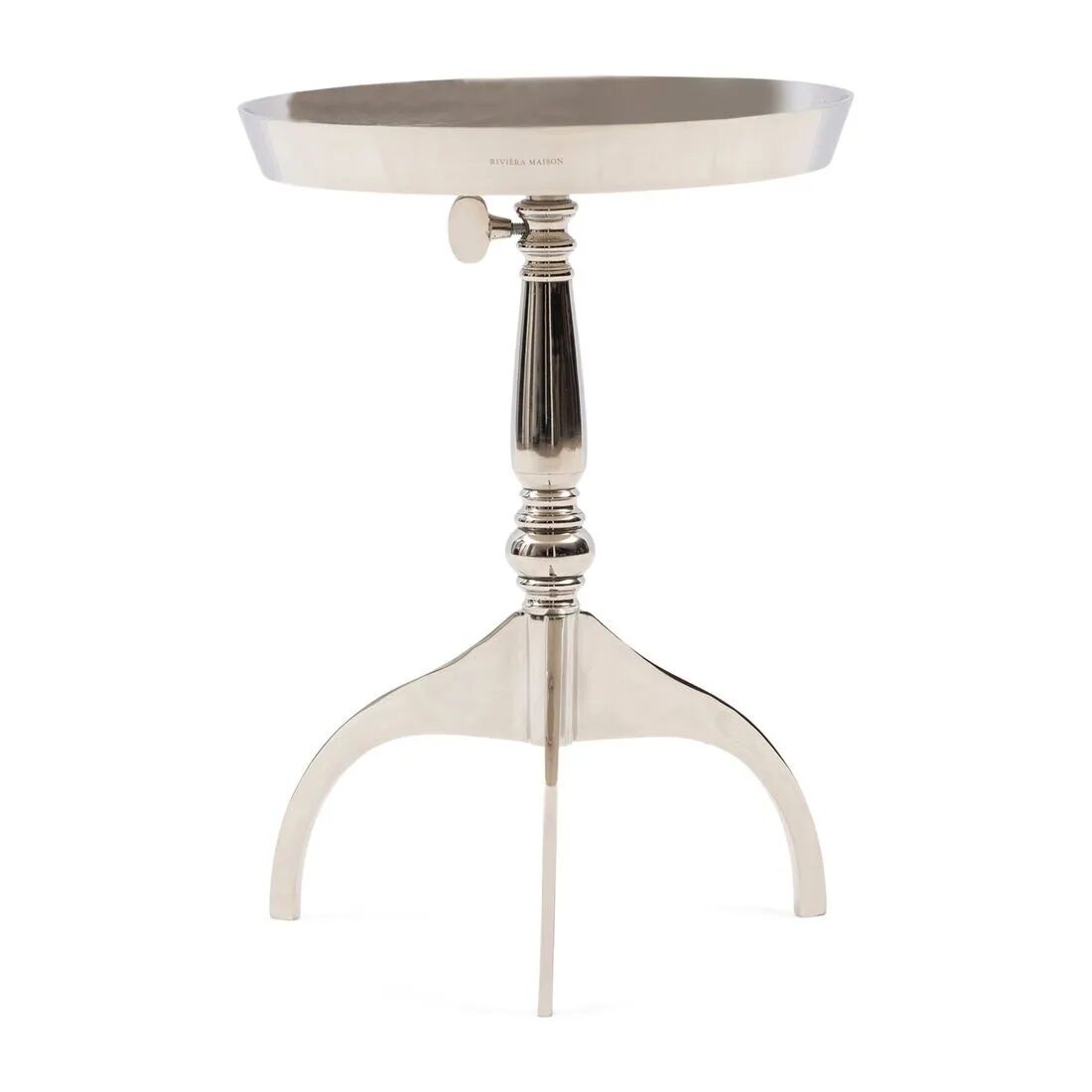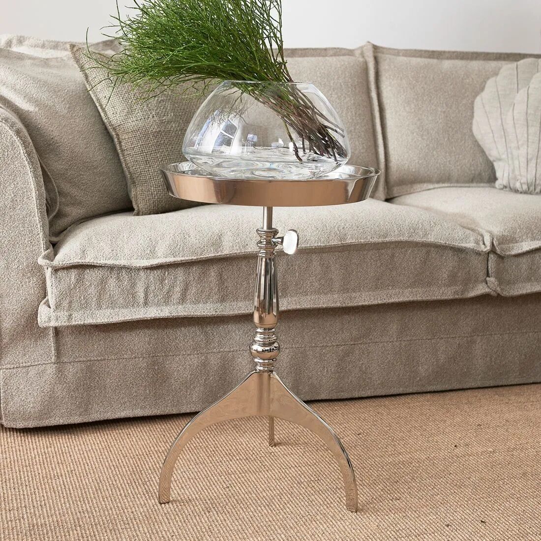 Der runde Beistelltisch vereint Eleganz und Zweckmäßigkeit und fügt sich perfekt in klassische Einrichtungskonzepte ein. Der aus hochwertigem silberfarbenem Aluminium gefertigte Tisch zeichnet sich durch einen soliden, stilvollen Sockel aus, der ihm einen zarten Charme verleiht. Dank seiner verstellbaren Höhe lässt er sich an verschiedene Bedürfnisse anpassen, was ihn zu einem vielseitigen Stück in jedem Raum macht. Die Tischplatte besteht aus zwei Schichten, von denen die obere als abnehmbare Ablage dient, so dass Sie Getränke, Bücher oder andere kleine Gegenstände leicht transportieren können. Diese Lösung erhöht nicht nur die Funktionalität des Tisches, sondern unterstreicht auch seinen eleganten Stil. Dieser klassische Beistelltisch eignet sich perfekt für das Wohnzimmer, das Schlafzimmer oder das Büro und bringt einen Hauch von klassischem Schick in die Einrichtung.